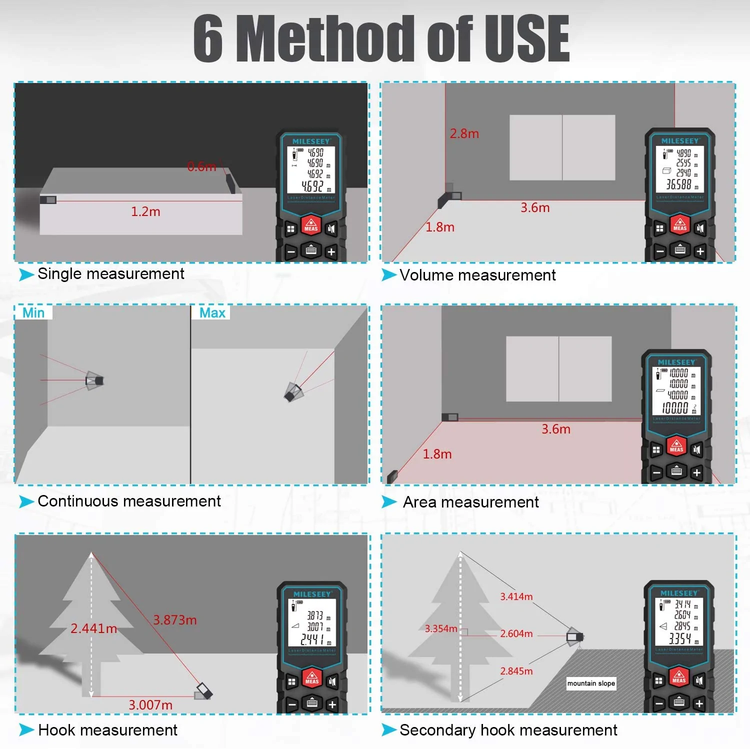 - برد اندازه گیری از 0.2 تا 40 متر - دقت اندازه گیری 2 میلی متر - نور لیزر قرمز Class2 - قابلیت برداشت 20 قرائت - باتری 2*AAA - ابعاد 28*50*115 میلی متر - قابلیت اندازه گیری طول، مساحت، حجم و اندازه گیری از طریق روابط فیثاغورث
