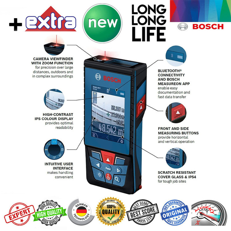 قطعات سوییس و آلمان و آمریکا مونتاژ مالزی / پردازنده اصلی ساخت شرکت لیلینویز آمریکا / قابیلیت اندازه گیری مسافت / قابلیت اندازه گیری غیر ممتد / قابلیت اندازه گیری مبنا / قابلیت اندازه گیری سطح / قابلیت اندازه گیری حجم / قابلیت اندازه گیری مختلف با استفاده از قوانین مثلثات مانند فیثاغورث / قابلیت اندازه گیری تعامد پیوسته / قابلیت اندازه گیری / قابلیت اندازه گیری شیب / کلاس حفاظتی IP۵۴ / برترین متر لیزری دنیا به انتخاب شرکت آمازون در این کلاس کاری / برای مستندسازی راحت میتوانید نتایج اندازه گیری را از طریق اتصال بلوتوث به برنامه Measure On رایانه شخصی منتقل کنید / دارای منظره یاب دیجیتال با عملکرد زوم برای اندازه گیری دقیق تا فاصه ۱۵۰متری / برای استفاده در فضای باز و سخت ترین شرایط محل